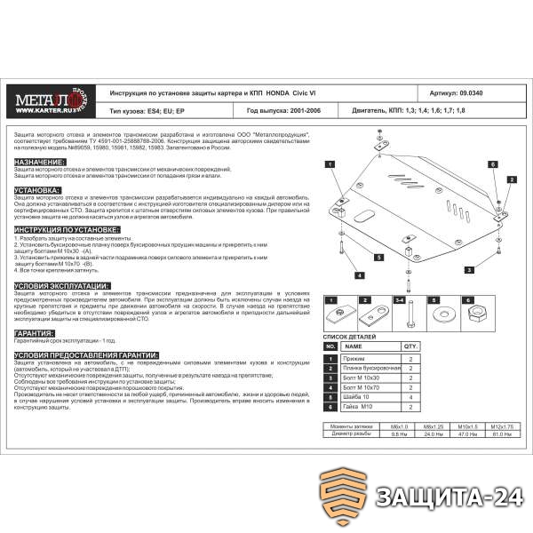 → Защита картера Civic 2001-2006 1,3; 1,4; 1,6; 1,7; 1,8 картера и КПП сталь 2,0 мм