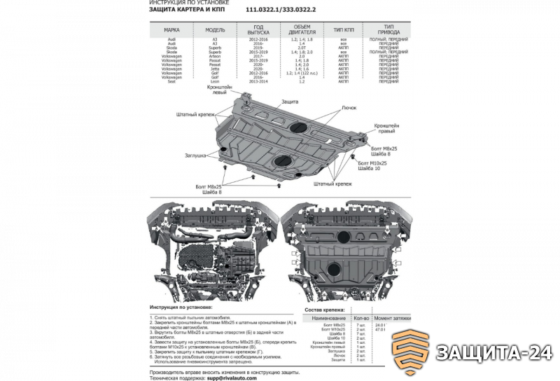 → защита картера и КПП Автоброня VW Passat B8,FWD V - 1,4TSI; 1,8TS