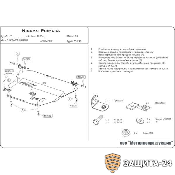 Защита картера и КПП для NISSAN Primera, 1 996-2 002, P10 P11 W10, сталь 2,0 мм. Артикул: 15.0296
