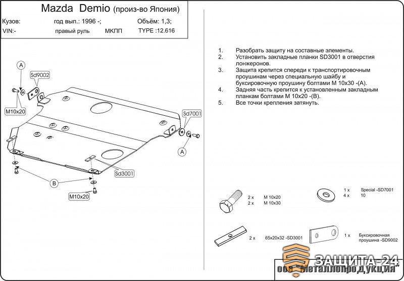 → Защита {картера и КПП} MAZDA Demio правый руль (1996 - 2002) 1,3 (кузов: DW3W) сталь 2 мм, Гибка, 10