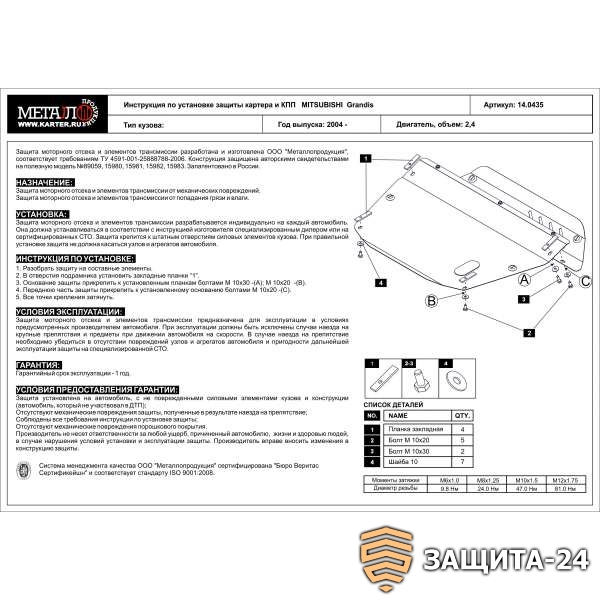 защита {картера и КПП} MITSUBISHI Space Wagon (1998 - 2003) 2,0 GDI; 2,4 GDI (кузов: N5) сталь 2 мм. Артикул: 14.0435